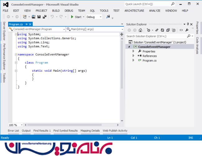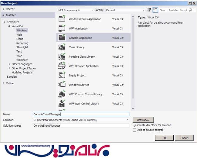 Visual Studio را باز میکنیم. file را انتخاب میکنیم.در داخل آن ، project را انتخاب و بعد ازآن پنجره ای با اسم “New Project” باز میشود. در این پنجره در قسمت چپ شما template ها را مشاهده میکنید. . آن را باز میکنیم در قسمت #Visual C ما Windows را انتخاب و سپس در پنجره اصلی Console application را انتخاب میکنیم.