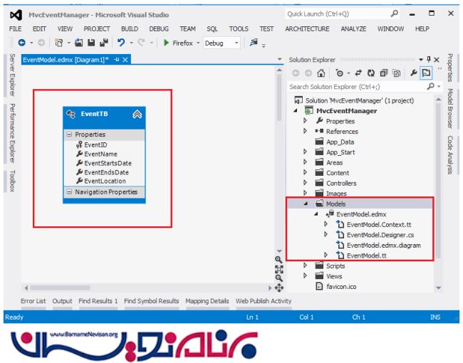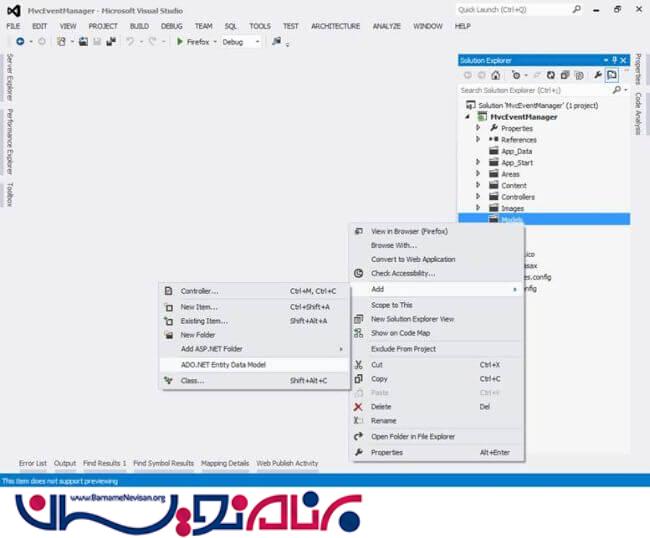 برای اضافه کردن ADO.NET Entity Framework به پروژه ، کافیست روی Model folder راست کلیک کنیم. در داخل آن گزینه add را انتخاب میکنیم و در آخر ADO.NET Entity Data Model را انتخاب میکنیم.