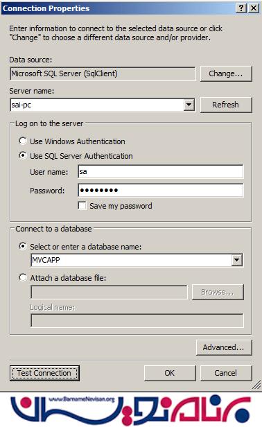 در این Connection Properties dialog شما نیاز به وارد کردن نام سرور SQL خود را دارید،سپس باید تعیین کنید که در کدام حالت باشید،حالت Windows Authentication یا Authentication SQL Server.