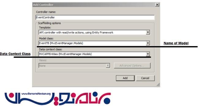 “API controller with read/write actions, using Entity framework” را انتخاب خواهیم کرد.