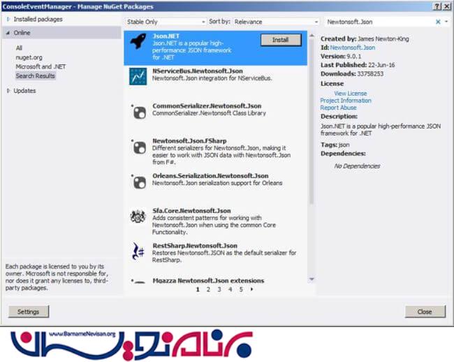 بعد از انتخاب کردن Manage NuGet Packages یک پنجره باز میشود. در داخل نوار جستجو، Newtonsoft.JSON را مینویسیم و install میکنیم.