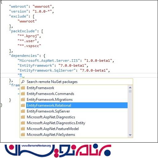 ما با استفاده از nuget package manager ، packageها و dependecyها را مدیریت میکنیم ، که این کار را میتوانید با افزایش ابزار ها انجام دهید . اما ما در این مورد تمام وابستگی ها را به فایل project.json .اضافه میکنیم . همانند عکس زیر :