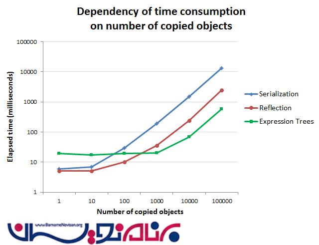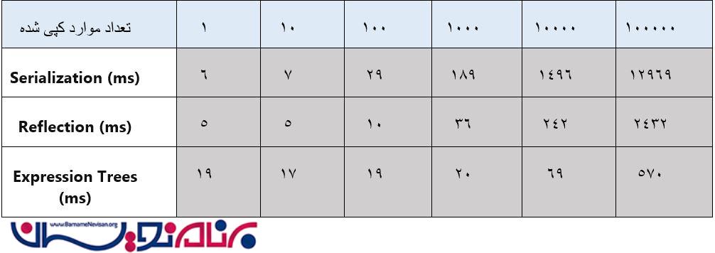 Reflection پنج مرتبه سریعتر است اما هنوز خیلی کند تر از پیاده سازی دستی تابع کپی است.