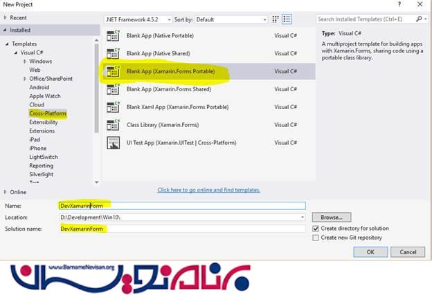 مرحله 3 : از بخش نشان داده شده، Cross Platform و سپس Blank App(Xamarin .Forms .Portable) را انتخاب کنید.