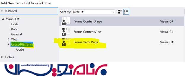 بر روی Portable Project (DevXamarinForms) کلیک راست کنید ، سپس Add - New Item -Cross-Platform - Forms Xaml Page را انتخاب کنید و نام آن را HomePage.CS بگذارید.