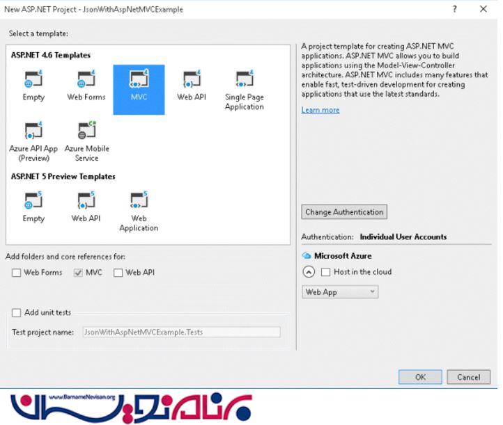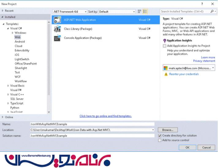 سپس از سمت چپ پنل، شما نیاز به انتخاب ASP.NET Web application دارید. که ما نام “JSONWithAspNetMVCExample”