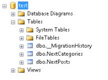 هنگامی که شما برای دفعه اول برنامه را اجرا میکنید و تا زمانی که از Code First استفاده میکنیم، پایگاه داده و جدول ها به صورت اتوماتیک ساخته میشود. بنابراین زمانیکه شما پایگاه داده را بررسی میکنید، در آن پایگاه داده test وجود دارد داخل آن با دو جدول به نام های NextCategories و NextPosts ساخته شده است.