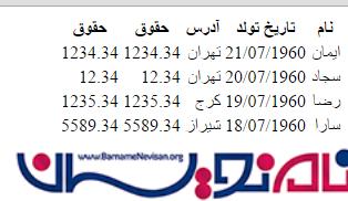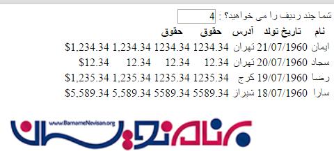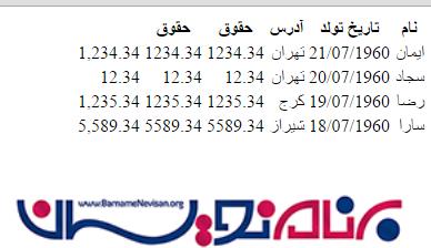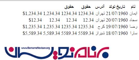 1. <table> 2. <thead> 3. <tr> 4. <th>نام</th> 5. <th>تاریخ تولد</th> 6. <th>آدرس</th> 7. <th>حقوق</th> 8. <th>حقوق</th> 9. </tr> 10. </thead>
