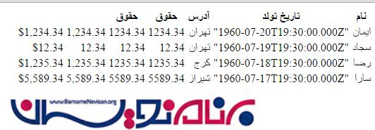 { name: "سارا", dateOfBirth: new Date("July 18,1960"), Address: "شیراز", Salary: "5589.34" }