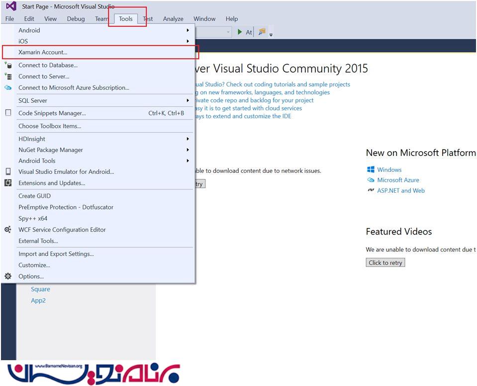 Visual Studio را باز میکنیم، به قسمت Tools میرویم و سپس بر روی Xamarin Account کلیک میکنیم و از پنجره ای که باز شد با حساب کاربری ای که ساخته ایم Login میکنیم.