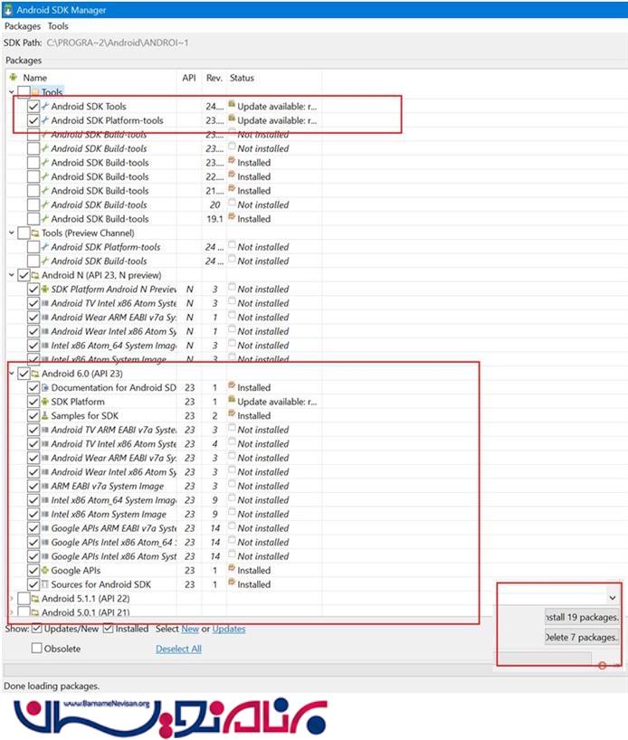برای این کار SDK Manager را باز میکنیم و اخرین api ها را نصب میکنیم.که این کار مشکلات ما را در زمینه Android API را حل میکند.