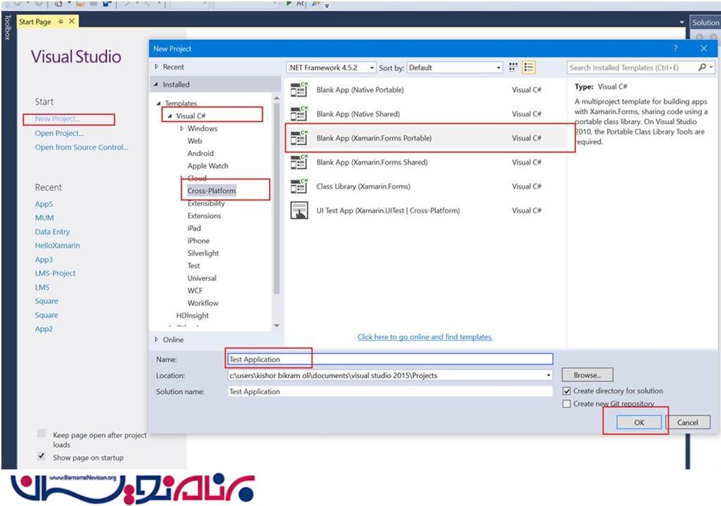 ساختن یک پروژه در Visual Studio ---> رفتن به file ---> کلیک بر New Project --->انتخاب #Visual C---> انتخاب Cross Platform ---> و در آخر انتخاب (Blank App (Xamarin.Forms Portable