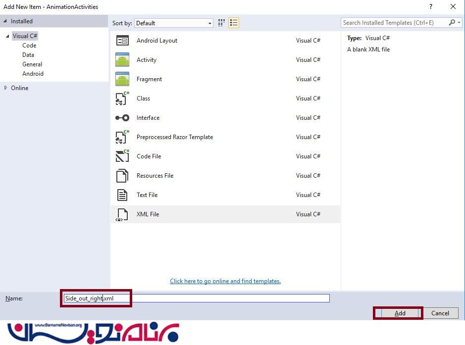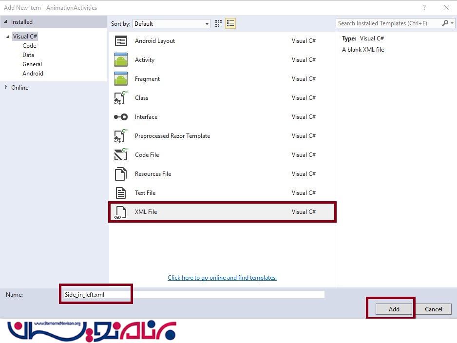 گام دهم : به مسیر olution Explorer-> Project Name-> Resources-> Anim بروید، کلیک راست کرده و گزینه ی add-> New Item را انتخاب کنید. در پنجره جدیدی که باز می شود، گزینه ی XML را انتخاب کنید و نام آن را Side_in_right.xml بگذارید. یک فایل دیگر به همین روش ایجاد کنید و نام آن را Side_out_left.xml بگذارید.