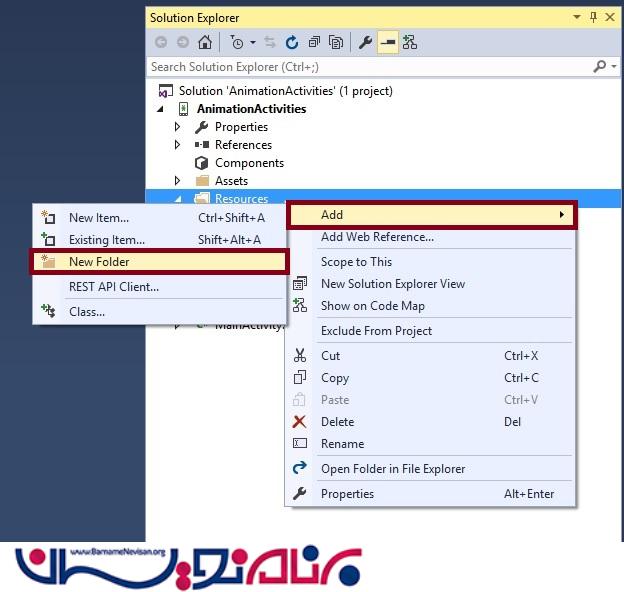 به مسیر Solution Explorer-> Project Name-> Resources بروید ، سپس کلیک راست کرده و یک پوشه جدید ایجاد کنید و نام آن را Anim قرار بدهید.