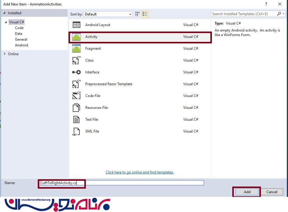 یک Activity ایجاد کنید. به مسیر Solution Explorer-> Project Name بروید، بر روی نام پروژه کلیک راست کرده و گزینه ی Add->New Item را انتخاب کنید. در پنجره ای که ظاهر می شود، گزینه ی activity را انتخاب کنید و نام آن را LeftToRightActivity.cs بگذارید.