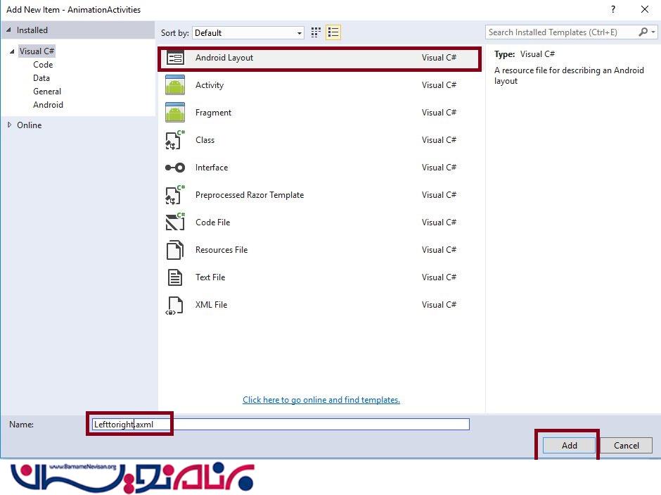 گام یازدهم : به مسیر Solution Explorer-> Project Name-> Resources-> Layout بروید، کلیک راست کنید و گزینه ی Add-> New Item را انتخاب کنید. در پنجره جدیدی که باز می شود، XML را انتخاب کنید و نام آن را RighttoLeft.axml بگذارید.