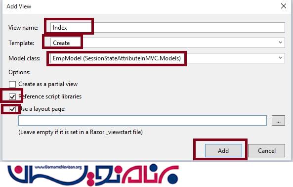 بر روی پوشه View کلیک راست کرده و یک View که نام آن Index و مدل آن را EmpModel قرار می دهیم .