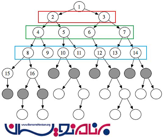 در این روش، ما از بالاترین گره ای که در صفحه می بینیم شروع می کنیم و لینک هایی که در هر صفحه وجود دارد را بر اساس *breadth/wide*(عرض/سطح) ردیابی می کنیم. ما عمل crawling را بر اساس اولین سطح که به رنگ قرمز است شروع می کنیم. زمانی که این دو لینک کاملا بررسی شدند، ما به سراغ سطح بعدی می رویم که به رنگ سبز است. بعد از اتمام بررسی این سطح، ما به سراغ سطح بعدی می رویم و همینطور تا آخر این کار را ادامه می دهیم.