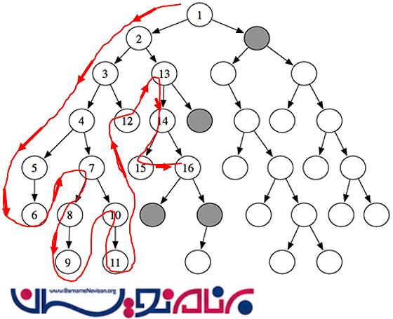 روش اصلی بعدی ، کاوش اول عمق است. این روش به این صورت است که ما لینک ها را به صورت عمقی مورد بررسی قرار می دهیم. در اولین مرحله، ما اولین لینک را در نظر می گیریم (2)، سپس به سراغ لینک بعدی (3) می رویم و این کار را تا رسیدن به اخرین عمق ادامه می دهیم. سپس به سراغ آخرین سطح کناری که دارای گره است می رویم و این کار را تا پیمایش اخرین گره ادامه می دهیم.