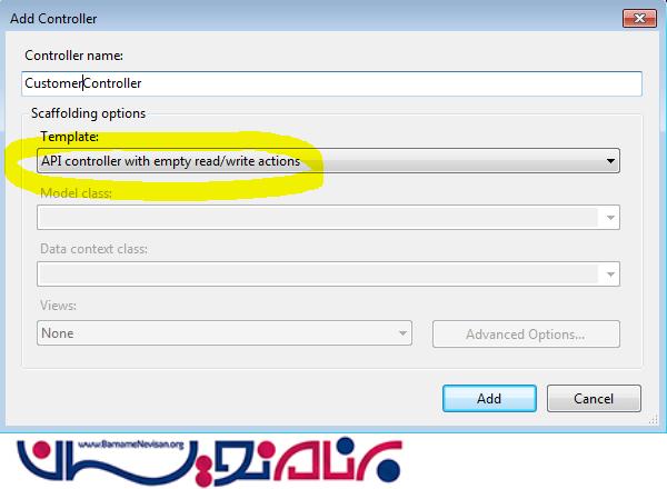3.در این قسمت میخواهیم یک کنترلر اضافه کنیم . در قسمت Template ، Controller With API read/write action را انتخاب می کنیم.