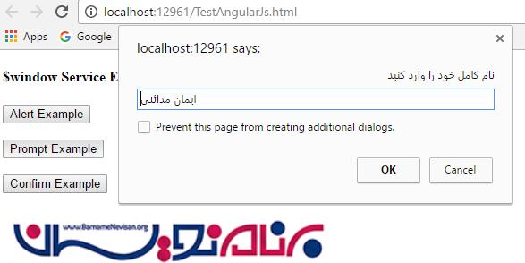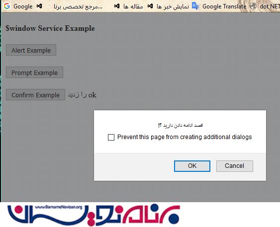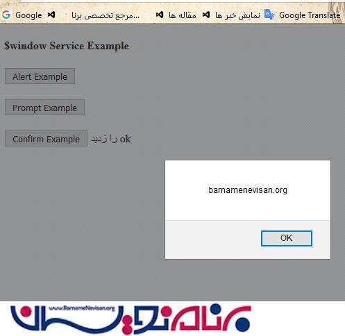 سرویس Windows$ برای شی ویندوز javascript است. و بسیار توصیه میشود که در AngularJs از window service$ به جای استفاده مستقیم از شی استفاده کنید.