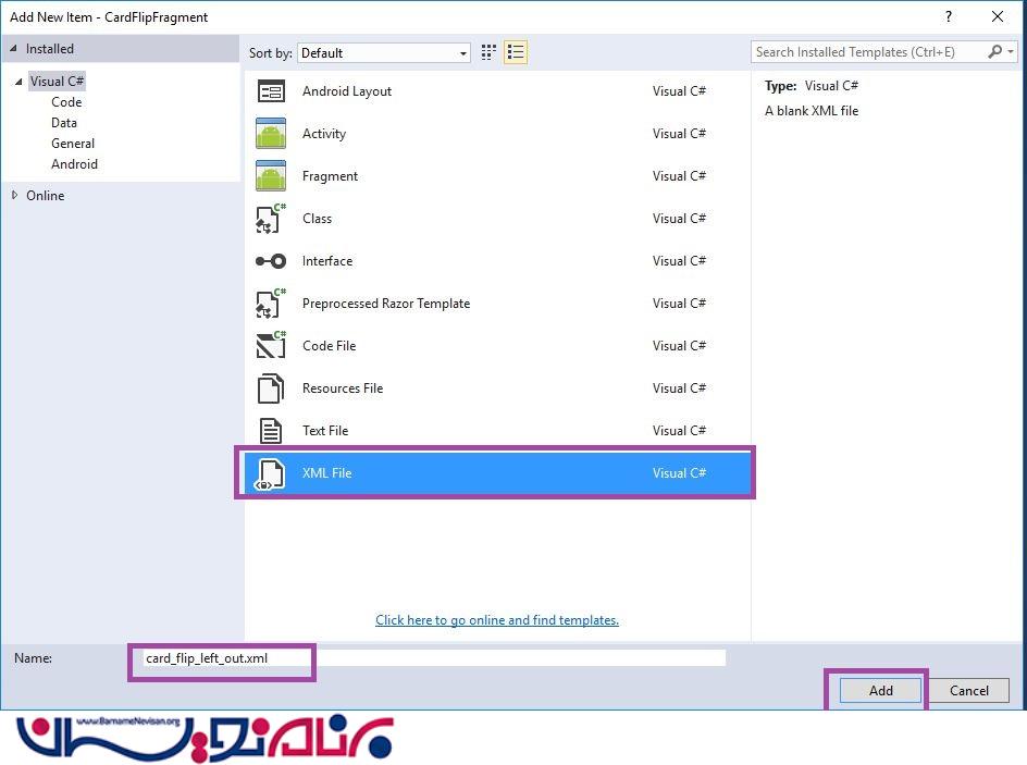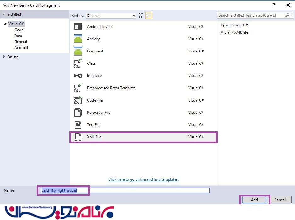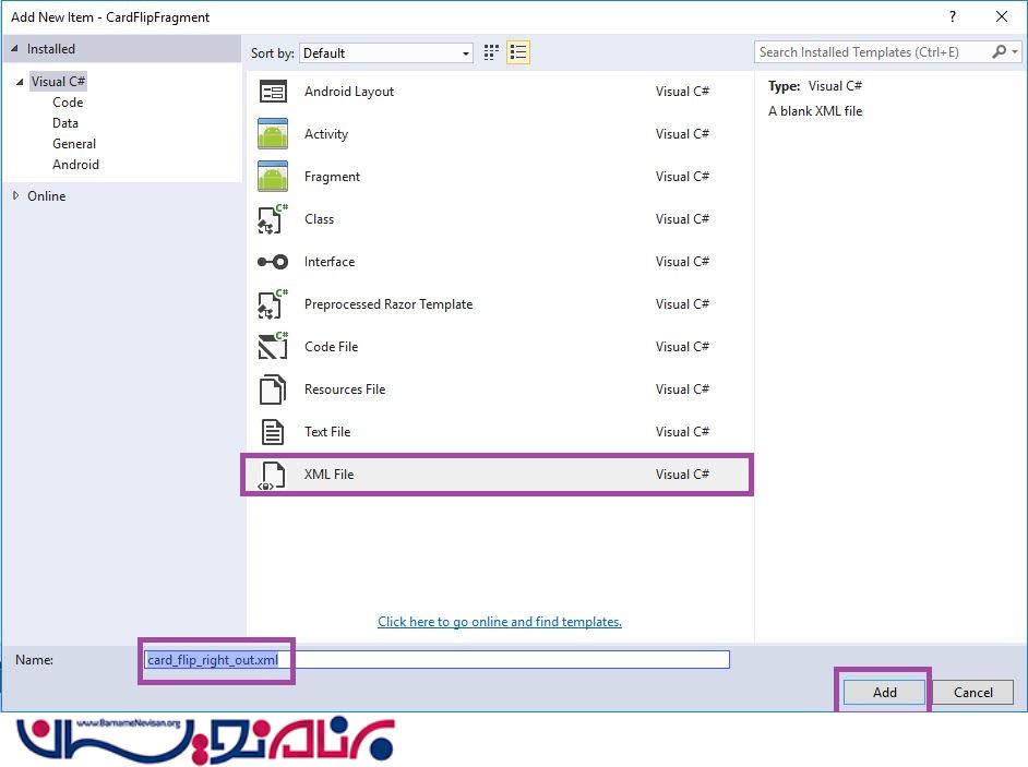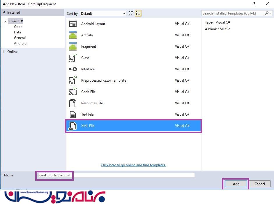 مرحله 4 - در اینجا ما چهار انیمیشن ایجاد خواهیم کرد. به مسیر Solution Explorer-> Project Name-> Resources-> Anim بروید، کلیک راست کرده و گزینه ی Add->New Item را بزنید. در پنجره جدیدی که باز می شود، XML را انتخاب کرده و نام آن را Card_flip_left_in.xml بگذارید. به همین روش، ard_flip_left_out.xml, Card_flip_right_in.xml و Card_flip_right_out.xml را نیز ایجاد کنید.