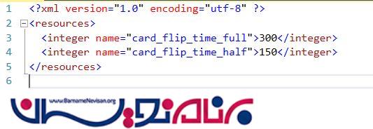 مرحله 10- به مسیر Solution Explorer-> Project Name->Resources->values -> Integers.xml بروید و کدهای زیر را در آن وارد نمایید.