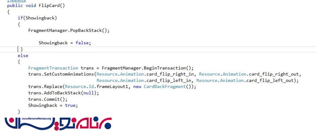 مرحله 12- صفحه MainActivity.cs را باز کرده و در زیر OnCreate() ، یک کلاس برای FlipCard ایجاد کنید.