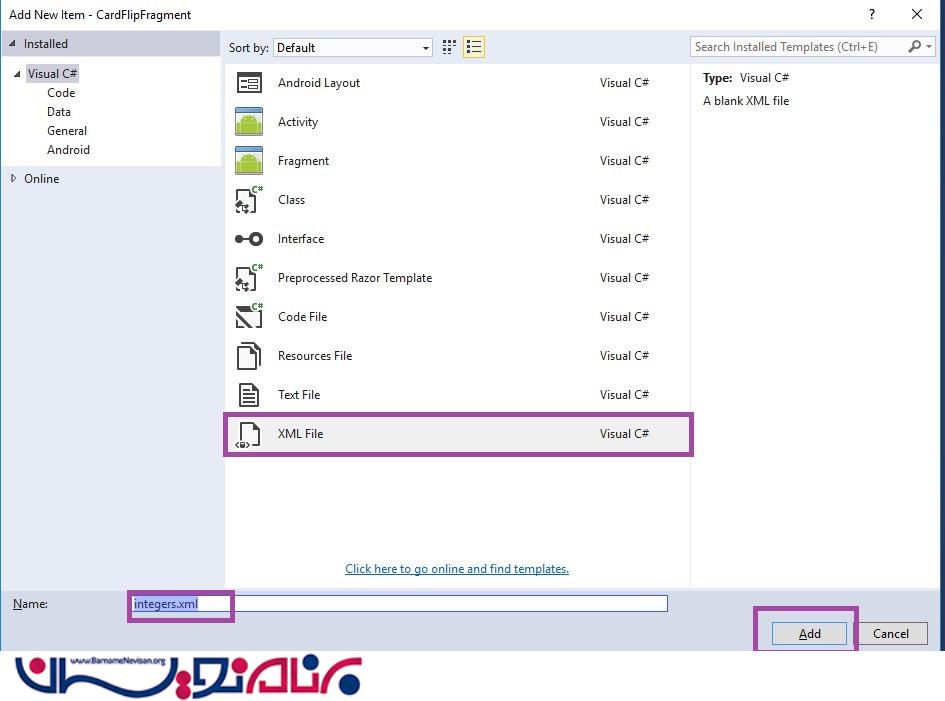 مرحله 5- به مسیر Solution Explorer-> Project Name-> Resources-> values بروید، کلیک راست کرده و یک فایل XML اضافه کنید و نام آن را Integers.xml بگذارید.