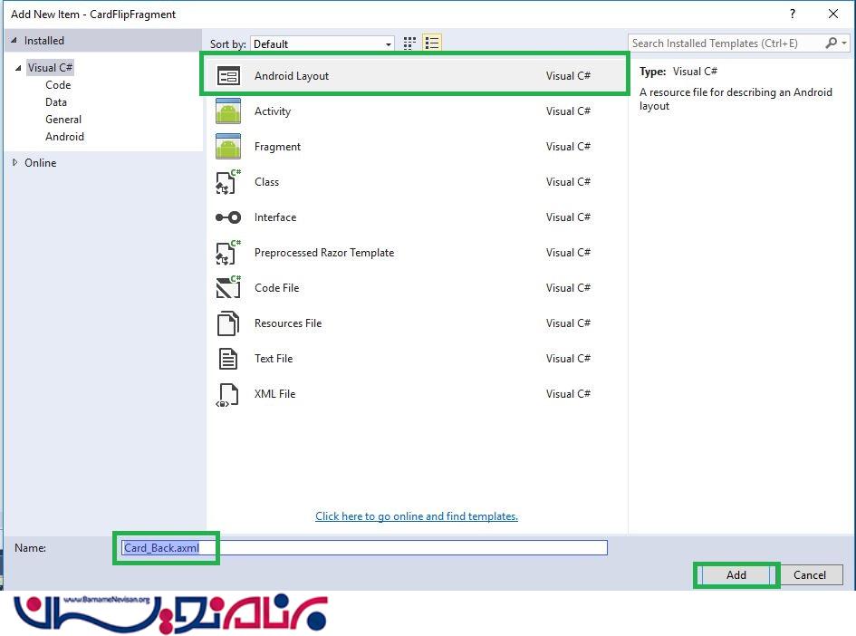 مرحله 2- صفحه ی Card_Back.axml را ایجاد کنید. به layout بروید. و مطابق زیر یک Android Layout اضافه کنید و نام آن را Card_back. axml بگذارید.