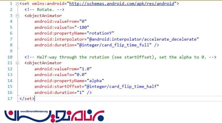 مرحله 7 -به مسیر Solution Explorer-> Project Name-> Resources-> Anim -> card_flip_left_out.xml بروید و کدهای زیر را در فایل مربوطه وارد نمایید.