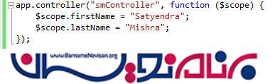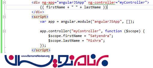 پس از ایجاد یک رفرنس برای ماژول ، شما میتوان با متغییرهای داخلی AngularJS کار کنید. در مثال بالا ، میتوان مشاهده کنید، که ما متغییر های FirstName ،LastName را تنظیم کرده ایم که همیشه به ماژول وابسته است .