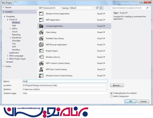 در اولین گام، یک پروژه جدید باید ایجاد کنید. برای سادگی کار ما از یک برنامه کنسول استفاده خواهیم کرد. در تصویر زیر جزئیات کار را می بینید.