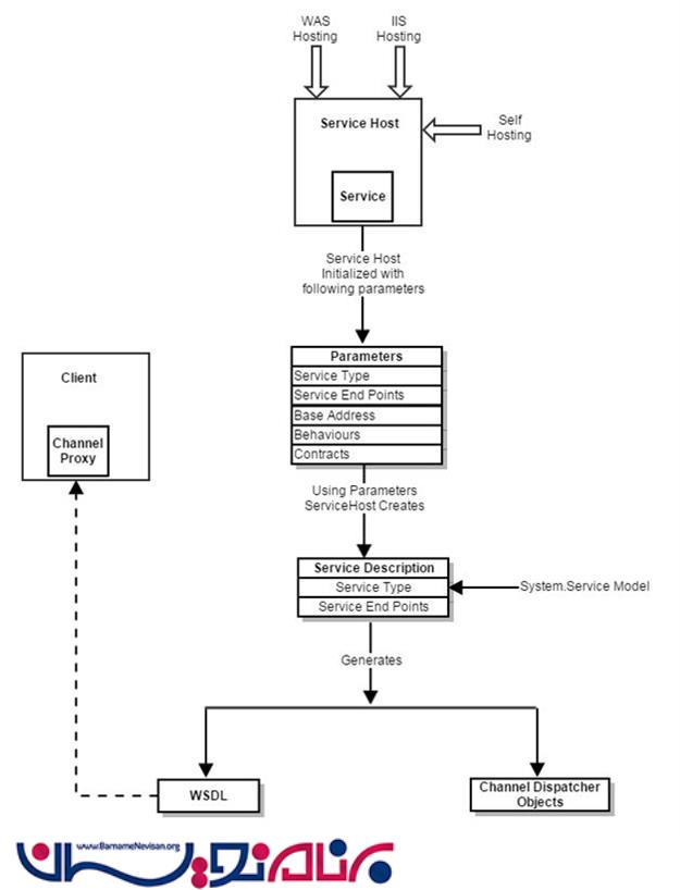 Service Host یک بخشی از فضای نام ServiceModel است. هر نمونه ی ServiceHost ، به یک یا چند سرویس در زمان اجرا اختصاص پیدا می کند. زمانی که شما می خواهید میزبانی را بر روی یک console application(self-hosting) انجام بدهید، شما نیاز به استفاده از class Service Host خواهید داشت. اگر در حال تلاش برای میزبانی سرویس خود بر روی WAS یا IIS هستید، این دو خودشان به صورت خودکار از نمونه ای از ServiceHost استفاده خواهند کرد. ServiceHost با پارامتر هایی مانند erviceType,Service EndPoints,Base Address و Behaviour شروع به کار خواهد کرد و یک description از سیستم ایجاد خواهد کرد که در نهایت بخشی از System.ServiceModel خواهد بود. ServiceDescription مسئول ایجاد یک سری توضیحات برای سرویس شامل نوع سرویس، هدف نهایی و رفتارهای سرویس خواهد بود. دیاگرام زیر فرآیند service host را نشان می دهد.