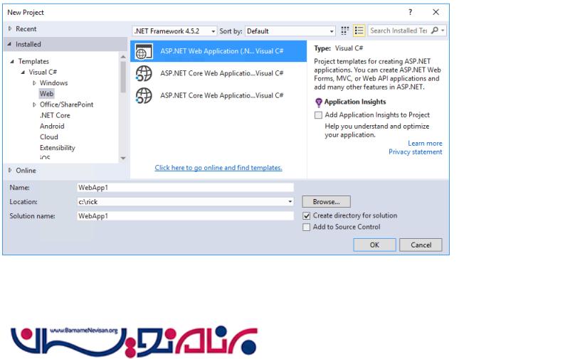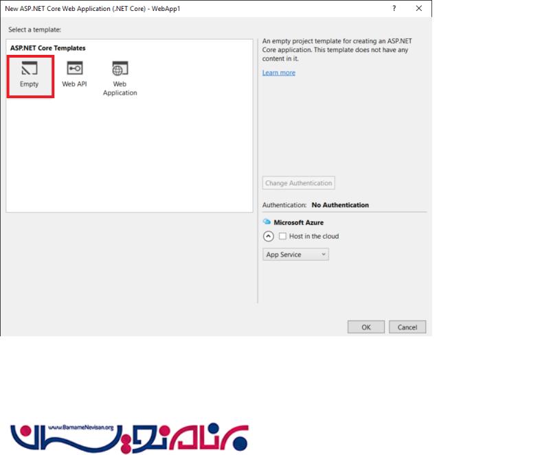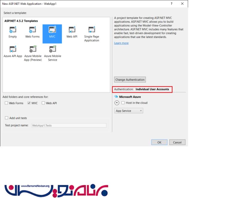دلخواه : شما میتوان این پروژه را خالی ایجاد نکنید و گزینهWeb Application را انتخاب کنید تا یک پروژه که یک قالب کلی را نمایش می دهد ایجاد شود ، همچنین در قسمت Individual User Accounts میتوان سیستم اهراز هویت خود را تنظیم کنید .