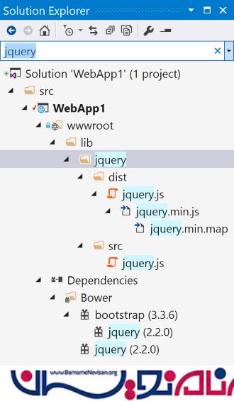 پس از این کا آن ها را به فایل bower.json اضافه کردید ، bower به صورت خودکار وابستگی ها را دریافت کرده و در پوشه wwwroot > lib قرار می دهد. برای اطمینان حاصل کردن از اضافه شدن وابستگی ها متوان با استفاده از جستجوی Solution Explorer آن را مشاهده کنید .