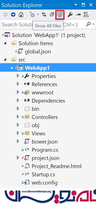نکته : فایل bower.json در Solution Explorer قابل رویت نیست برای مشاهده آن باید در Solution Explorer آیکون Show All Files را انتخاب کنید تا بتوان آن را مشاهده کنید .