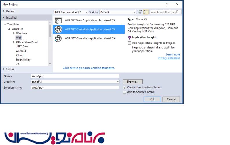 برای نشان دادن تغیرات اعمال شده یک پروژه از نوع ASP.NET MVC ایجاد میکنیم و نام آن را Web App1 قرار می دهیم .و در مرحله بعد یک پروژه از نوع ASP.NET Core MVC ایجاد می کنیم .