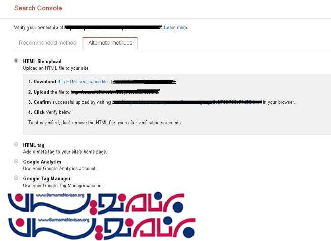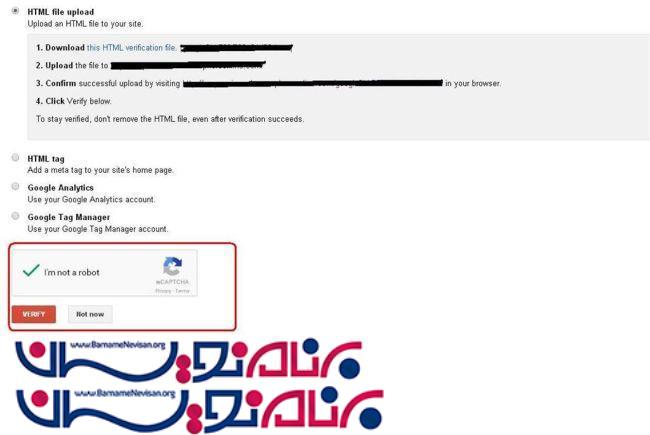 یک سند Html verification دانلود کنید و آن را در Root وب سایت خود بارگذاری کنید.