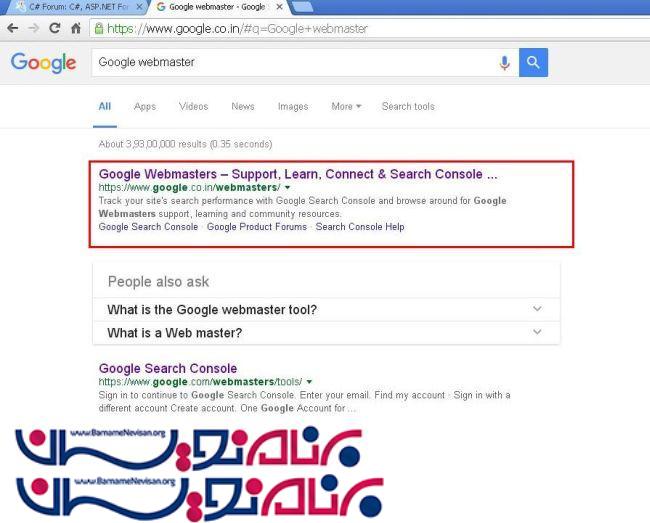 صفحه جستجو google را باز کنید،و متن "Google Webmaster" را جستجو کنید.
