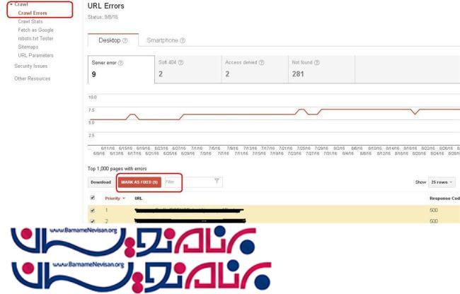 در منو سمت چپ برای دیدن جزییات خطاها در وب سایتتان روی Crawl و سپس Crawl Errors کلیک کنید.که برای حل آنها برروی "MARK AS FIXED" کلیک کنید.