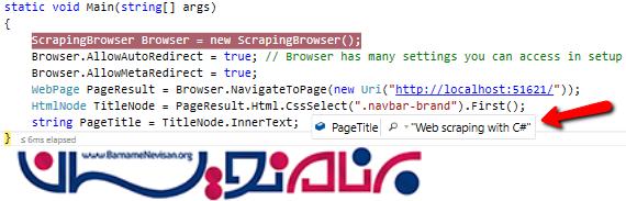 در کنسول، یک شی ScrapingBrowser ایجاد می کنیم (که مرورگر مجازی ما است ) و موارد پیش فرضی که می خواهیم را برای آن تنظیم می کنیم. به عنوان مثال، تنظیمات زیر می توانند اعمال شوند: