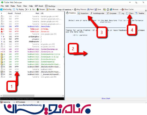 1-در سمت چپ، هر ترافیکی که وجود دارد توسط Fiddler نمایش داده می شود. این ترافیک شامل صفحه اصلی، و هر thread موجود است. شما می توانید از Fiddler استفاده کنید تا ببینید حجم ترافیک بر روی صفحه ، مربوط به کدام المان در صفحه است.