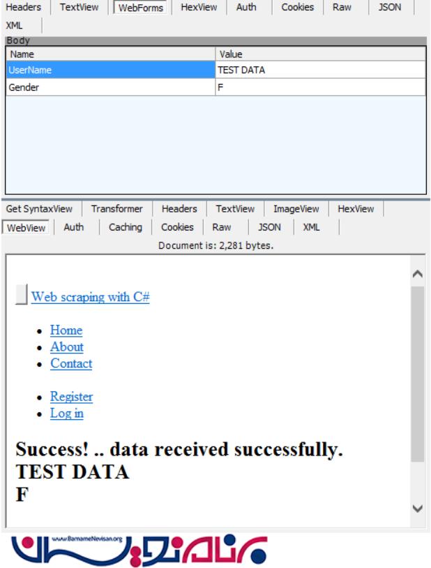 در تصویر زیر می توانید ببینید که فرم در درخواست فرستاده می شود و سپس پاسخ از جانب سرور بازگردانده می شود: