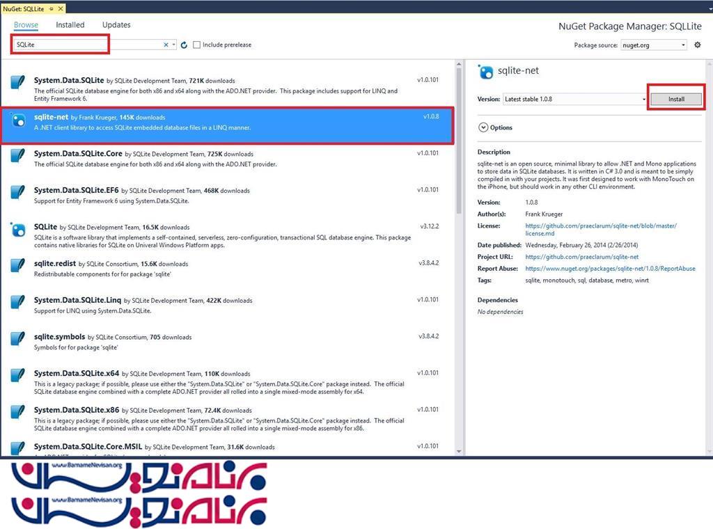 به مسیر Solution Explorer-> Project Name-> References بروید، بر روی Manage Nuget Packages کلیک راست کرده و در پنجره ای که ظاهر می شود، گزینه ی SQLite-Net Packages را انتخاب کنید و پایگاه داده برنامه را نصب کنید.