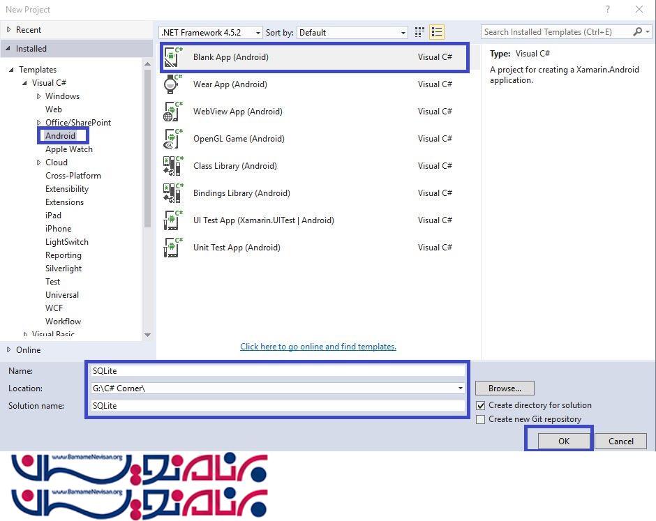 از مسیر Visual Studio->New Project->Templates->Visual C#->Android->Blank App یک پروژه جدید ایجاد کنید.