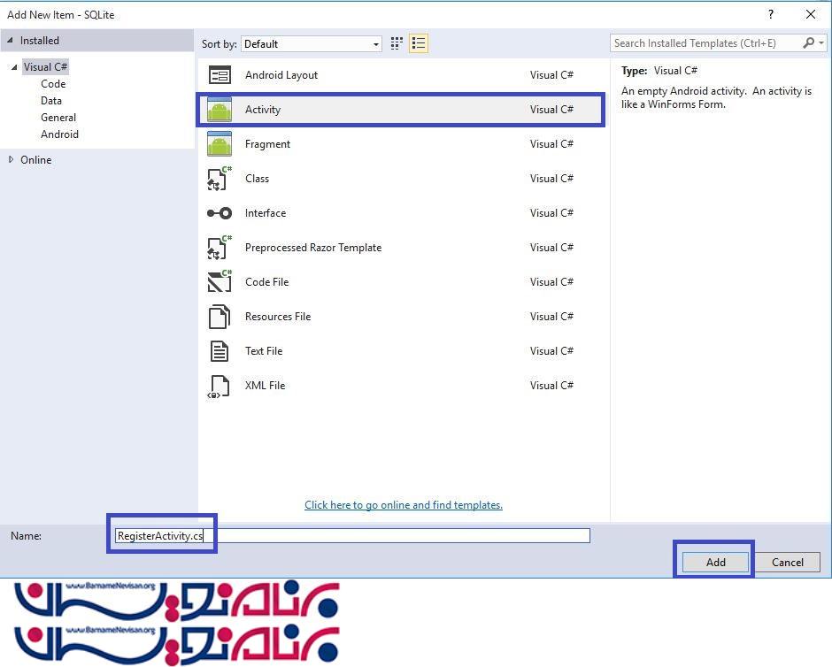 به مسیرSolution Explorer-> Project Name بروید و با کلیک راست، یک Activity به پروژه اضافه کنید و نام آن را RegisterActivity بگذارید.