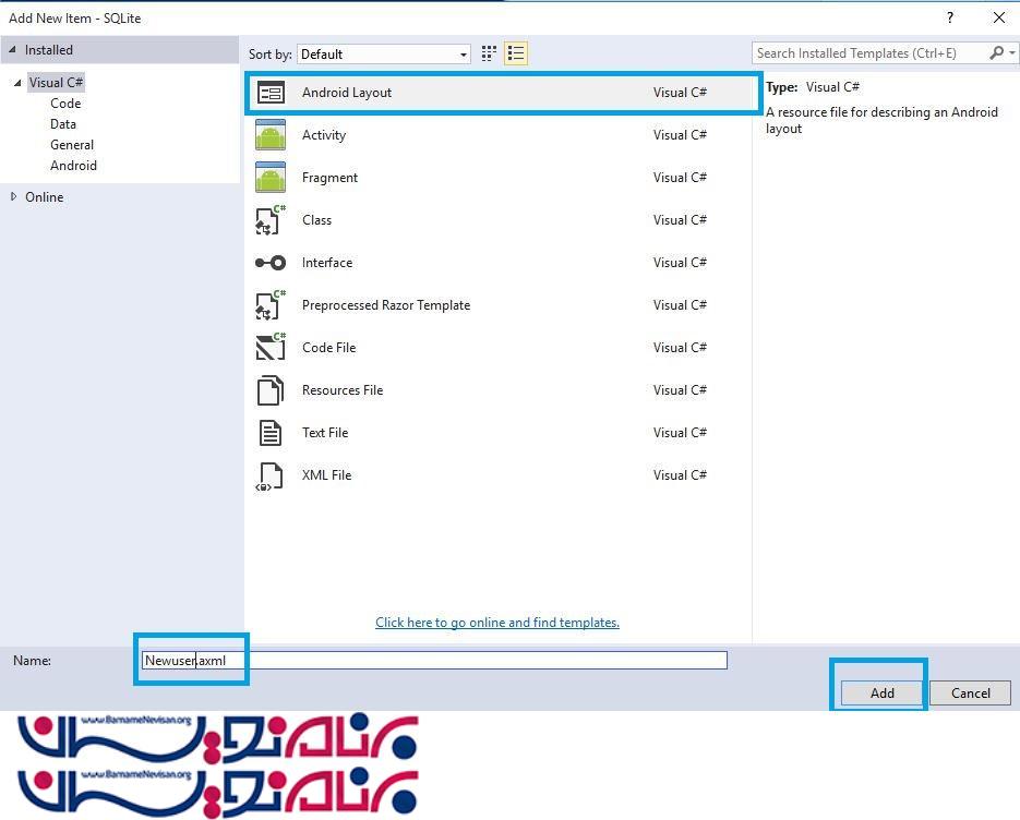 سپس به مسیر Solution Explorer-> Project Name-> Resouces->layout بروید، کلیک راست کنیدو در پنجره جدیدی که باز می شود، Android layout را انتخاب کنید. نام آن را NewUser بگذارید و دکمه Add را بزنید.