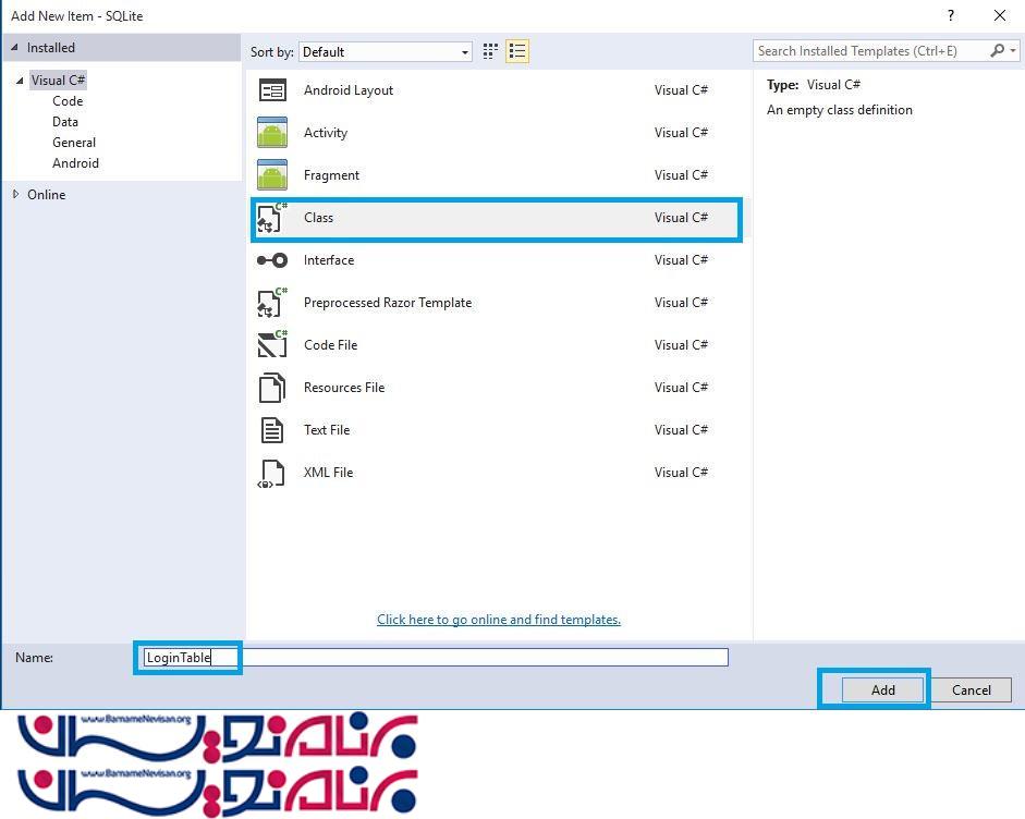 در این مرحله نیاز داریم یک جدول پایگاه داده ایجاد کنیم. بنابراین یک Data Layer Class ایجاد می کنیم. برای این کار بر روی نام پروژه کلیک راست کنید و یک کلاس به نام LoginTable اضافه کنید.