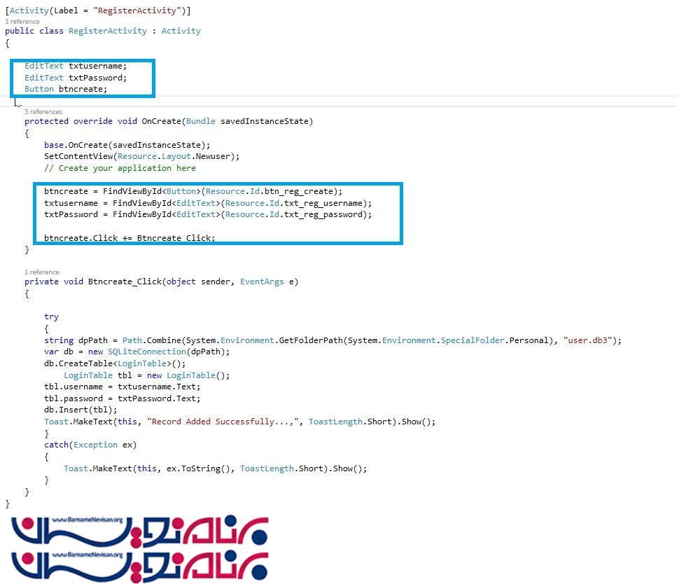 سپس به مسیر Solution Explorer-> Project Name-> RegisterActivity.cs بروید ، فضای نام های زیر را اضافه کنید و کدهای زیر را در آن اضافه کنید.